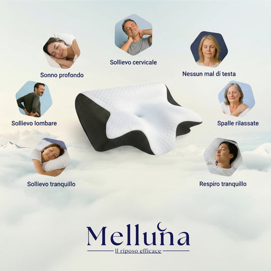 Dormi finalmente senza fastidi, dolori o risvegli improvvisi. Melluna è il cuscino ortopedico progettato per adattarsi al tuo corpo e offrirti un riposo profondo, naturale ed efficace ogni notte.